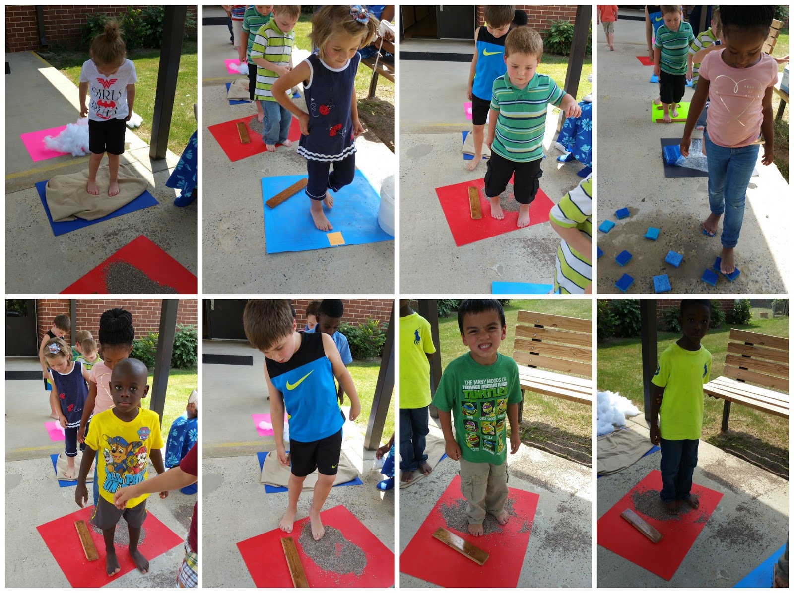Students took off their shoes and enjoyed the feel of various textures beneath their feet! Students felt things that were soft, smooth, hard, rough, squishy and wet.